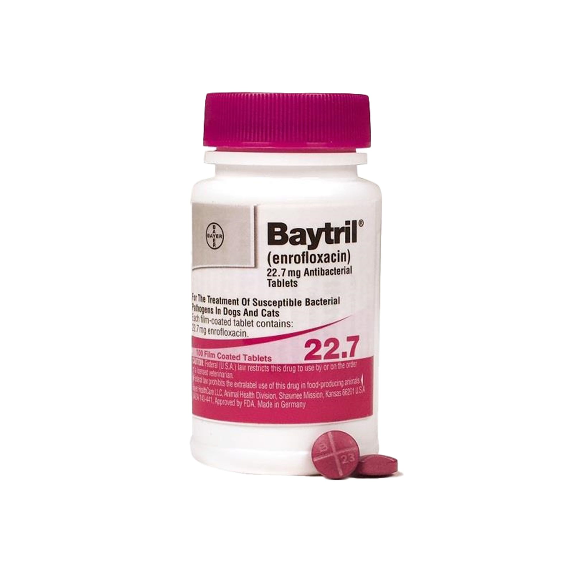 It is most commonly administered to treat infections in the skin and ears especially in cats. Baytril also inhibits the enzyme that the bacteria need to transcribe DNA which kills them. Smaller size cats might need to take ¼ or ½ of the 22 mg tablet.